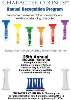 Youth Award: An award to one youth selected by their school for exemplary character and presented at CHARACTER COUNTS! Celebration Night. Note: In selecting its Annual Youth Award recipient, a school may choose to use a nomination submittal form similar to the one provided for Bloomingdale CHARACTER COUNTS! Coalition’s (BCC!C’s) Annual Recognition Award. BCC!C has heretofore not been involved with the Youth Award nomination and selection process by the schools. It is possible that a school may want to honor some nominated students in addition to the one being chosen for the Youth Award.
